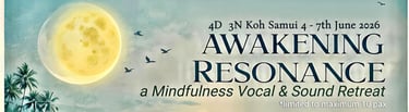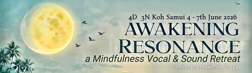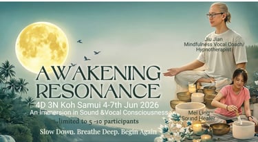 Awakening Resonance is a 4 Days 3 Nights Mindfulness Vocal & Sound Healing Retreat in Koh Samui (4–7 June 2026). Held at the natural midpoint of the year, this intimate retreat invites participants to pause, reflect on the first half of 2026, and step into the months ahead with renewed clarity, balance, and inner resonance.
